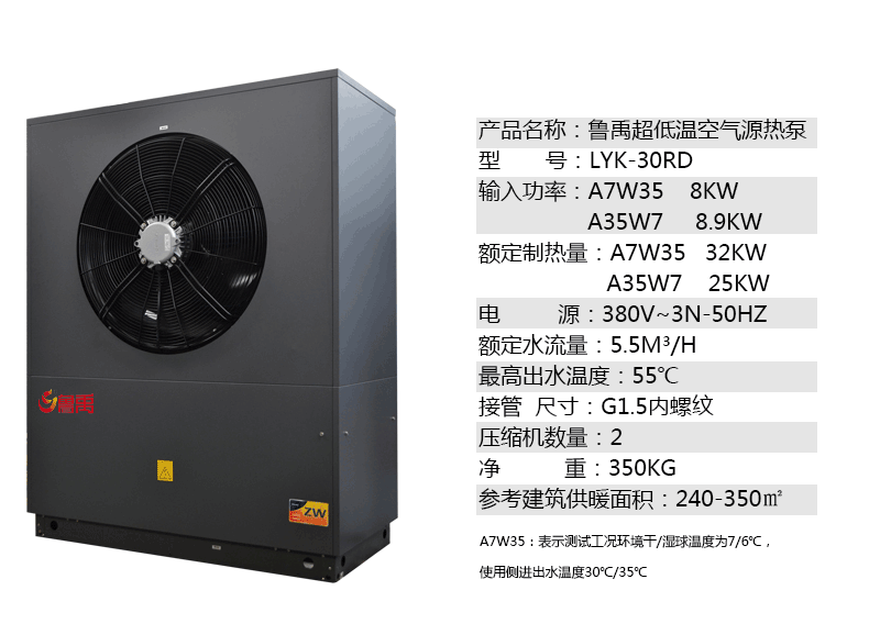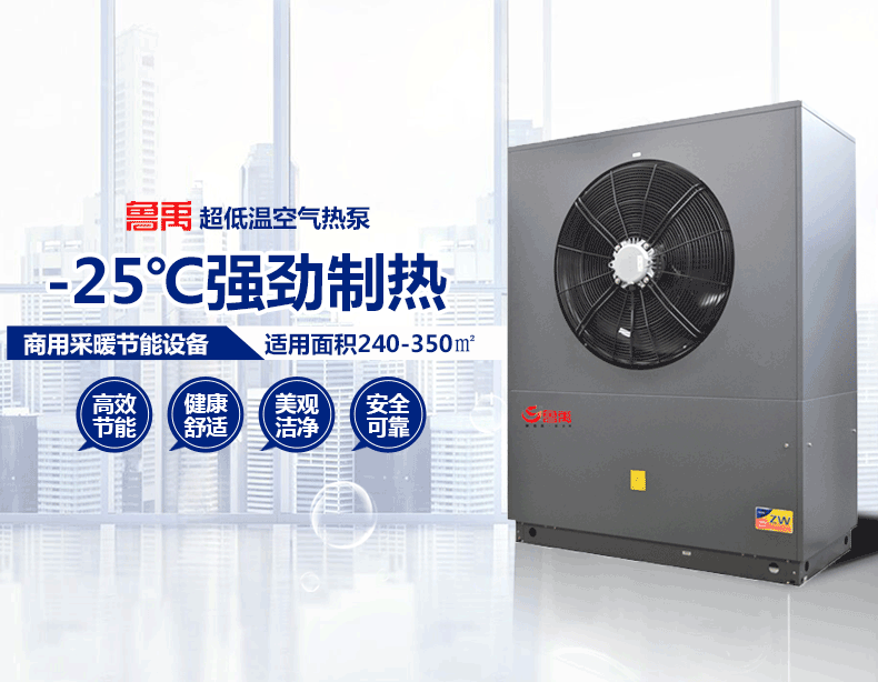 鲁禹家用空气源热泵供暖机组由压缩机、冷凝器、膨胀阀、蒸发器等部件组成。在室外热能转移过程中,每消耗1份电能,就可以为室内提供4份的热量(根据不同运行状态,该值也会有所不同)。