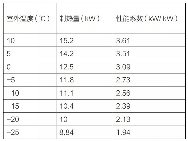 空气源热泵机组做采暖的热源设备,与采暖系统的耗电量有关的主要是制热量和性能系数两个参数。我们以一款5HP低温变频机的性能参数(含水泵)为例来说明,出水温度按41℃计算,表2是该机器的采暖全工况的性能参数表。