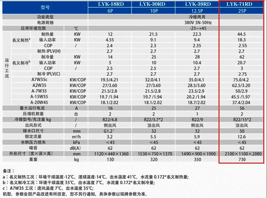 机组型号:超低温空气源热泵LYK-71RD(25P超低温空气源热泵机组)