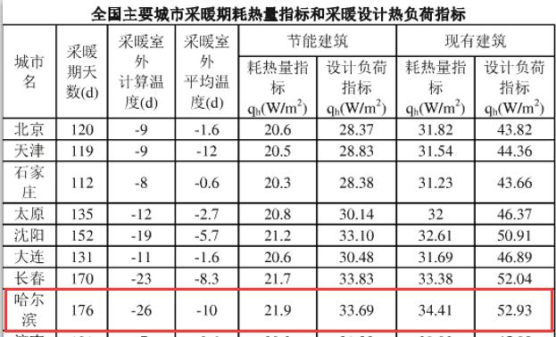 根据《全国主要城市采暖期耗热量指标和采暖设计热负荷指标》,哈尔滨节能建筑每平方米采暖设计负荷指标为33.69w/㎡*24h*176d/1000=142.31kwh/㎡