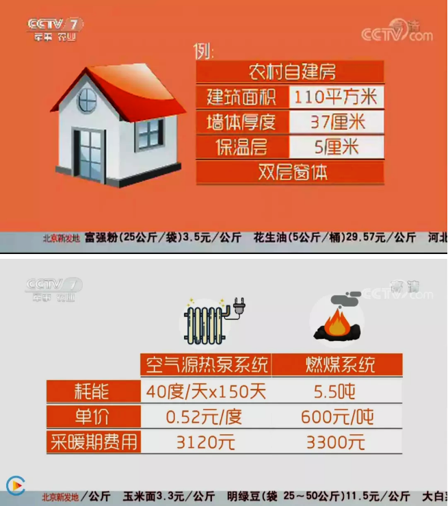 报道指出,以农村自建房为例,建筑面积110平方,墙体厚度37厘米,保温层5厘米,双层窗体,按照150天的采暖期,空气源热泵系统耗电量为40度/每天,每度为0.52元,采暖期费用为3120元。而燃煤需要5.5吨,以每吨600计算,则需要3300元。