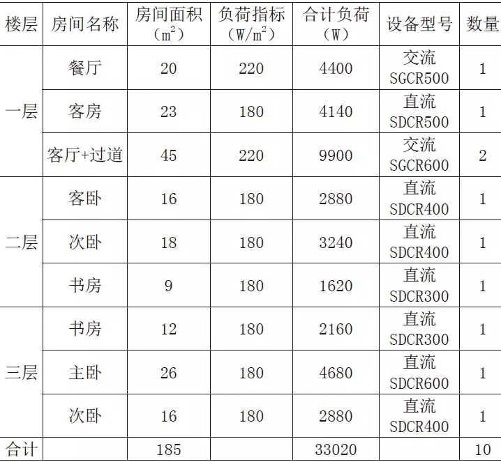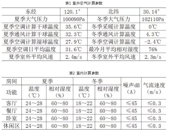 冷负荷由人体、灯光、设备、食物等冷负荷和外围护结构(外墙、外窗和外门)及内围护结构(内墙、内窗、内门和楼板等)的得热组成;经负荷计算及规范,参照本地的设计经验,别墅建筑的空调冷负荷设计指标为180W/m2~220W/m2。
