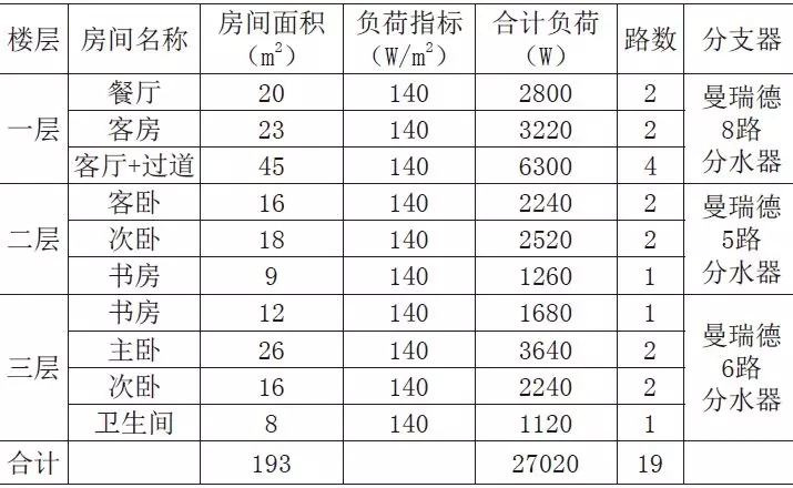 热负荷由外围护结构和内围护结构的基本耗热量及其附加耗热量和冷空气渗透耗热量组成;冬季供暖的室内设计温度设为20℃,经负荷计算及规范,参照本地经验,别墅建筑的供暖热负荷设计指标为140W/m2,符合要求。