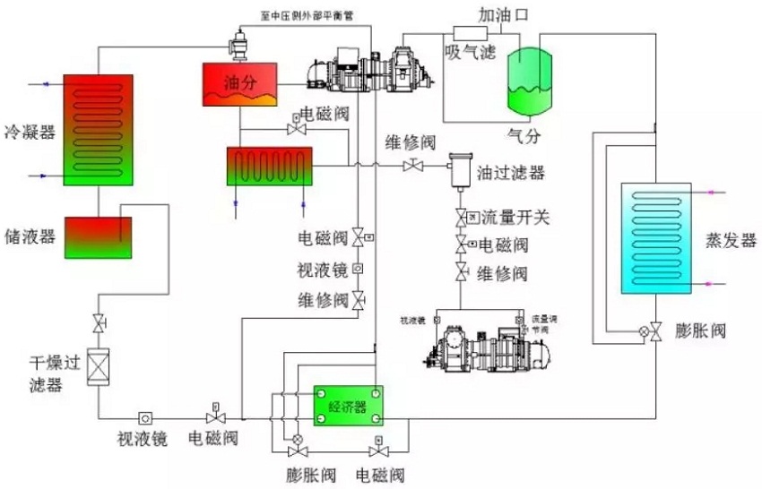 2.¼¼ÊõÔÀí¼°¹¤ÒÕµ¥»úË«¼¶ÂݸËѹËõ³¬´óÐÍ¿ÕÆøÔ´Èȱûú×éÊÇÒ»ÖÖ»ùÓÚÄæ¿¨ÅµÑ»·ÔÀí½¨Á¢ÆðÀ´µÄ½ÚÄÜ¡¢»·±£¡¢ÖÆÈȸßЧ¡¢¼¯ÈȲ¢×ªÒÆÈÈÁ¿µÄ×°ÖᣲÉÓõ¥»úË«¼¶ÂݸËѹËõ¼¼Êõ£¬Ê¹Ñ¹Ëõ»úÄÚÈÝ»ý²úÉúÖÜÆÚÐÔµÄÈÝ»ý±ä»¯£¬Íê³ÉÖÆÀä¼ÁÆøÌåµÄÎüÈ롢ѹËõºÍÅųö£¬ÊµÏÖ²»Í¬¸ßµÍѹ¼¶¼äµÄ»¥»»£¬²¢Í¨¹ýÓëʵ¼Ê¹¤¿öºÏÀí´îÅäÅÅÁ¿±È£¬´ïµ½»ú×é×îÓÅÔËÐÐ״̬¡£ÏµÍ³ÔÀíͼÈçÏ£º