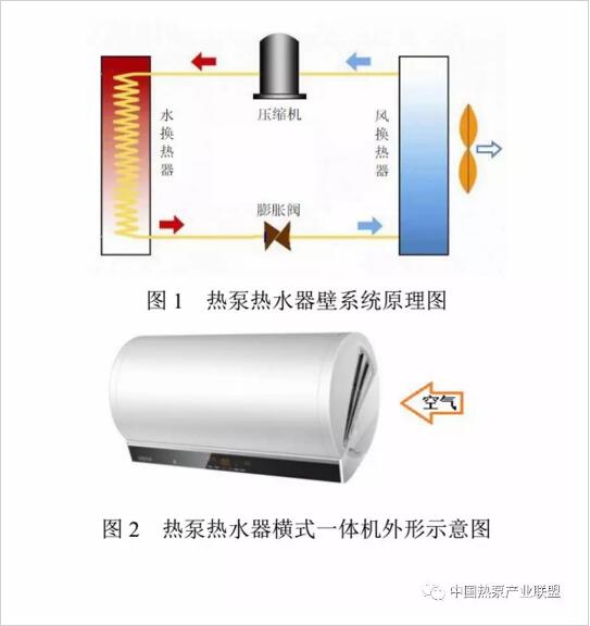 热泵热水器一体机由空气源热泵系统和水箱构成,相对于传统的电热水器,增加了冷媒系统,系统原理图如图1所示。由于家用壁挂式安装承重限制及外观要求,通常外形与传统电热水器相同,如图2所示。