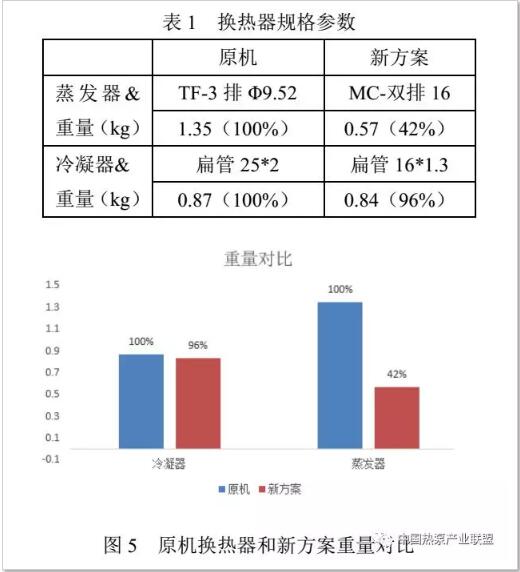 本文蒸发器如图3所示,采用微通道换热器替代原机铜管翅片换热器,可以有效降低重量和成本;冷凝器如图4所示采用新型微通道扁管,并优化了与内胆外壁面的接触面积,成本持平的情况下增加了约30%的换热面积。表1及图5表示了蒸发器和冷凝器的规格及重量对比。