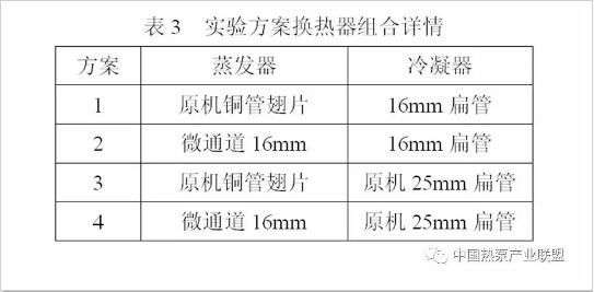 本文为了更好的评价替代方案的蒸发器和冷凝器的性能,进行了四组不同换热器组合的实验,详细的实验方案如表3所示。