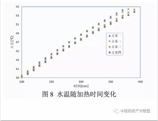 四种方案均是在环境温度20/15的标况下,将水从15℃加热到55℃时停止测试。