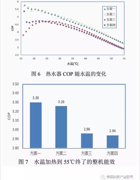 图6和图7分别为四组不同方案,总COP随水温的变化情况以及水温从15℃加热到55℃的整机能效数值。从图中可以看出,COP随着水温的升高不断降低,主要原因在于,随着水温的上升,高低压压比增大,压缩机功耗增加,能力降低,COP从而不断下降;