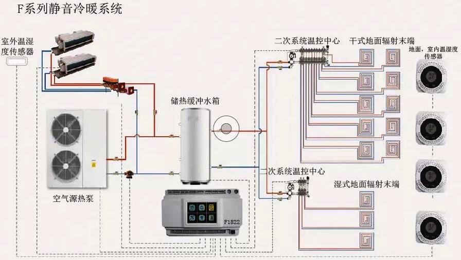 F100静音冷暖控制系统引入了高精度控制水力二次系统的温控中心,实现了高舒适度的地面辐射供暖方式,辐射末端必须依靠全动态水温的二次系统来控制室内的温度,持续保持室内的恒温。