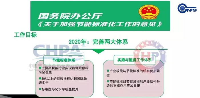 首先,向大家简要介绍一下我国标准标识的概况。我国高度重视节能标准化工作,除《节能法》之外,很多政策文件都提到要加快制定能效和能耗限额标准。在2015年国务院办公厅颁布的《关于加强节能标准化工作的意见》中提到,到2020年国家要完善两大标准体系建设:一是“节能标准体系”,提出主要高能耗行业实现能效限额标准全覆盖,80%以上的能效指标都要达到国际先进水平,标准国际化水平要明显提升;二是“实施与监督工作体系”,要求产业政策与节能标准结合更加紧密,节能标准对节能减排和产业结构升级起到显著的支撑作用。