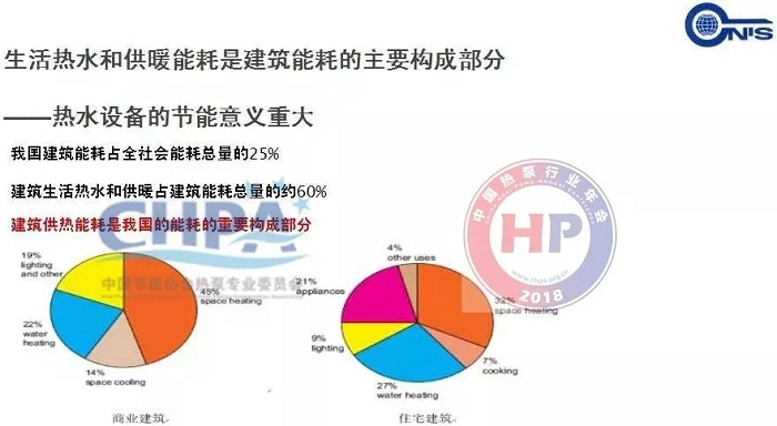 下面介绍一下国内外相关标准,据统计,我国建筑能耗约占全社会能耗总量的25%,建筑生活热水和供暖占建筑能耗总量的约60%,所以说,热水和供暖设备的节能潜力非常巨大。据产业在线统计报告显示,我国生活热水器销量非常大。2017年电热水器销售2788.3万台,占热水器销量的45.6%,燃气热水器有27.7%的增长,空气源热泵热水器有2.5%的增长,销售109.4万台,占比1.8%。