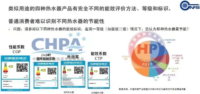 依据国家能效标准,我国已经实施了燃气热水器、电热水器、太阳能热水器和热泵热水器的能效标识,但类似用途的四种热水器产品有完全不同的能效评价方法、等级和标识,普通消费者难以识别不同热水器的节能性。根据2015年中国热泵产业联盟针对消费者调查,49%的消费者表示只观察同样标注了2级的四种产品的标识,无法比较哪一个产品更节能。