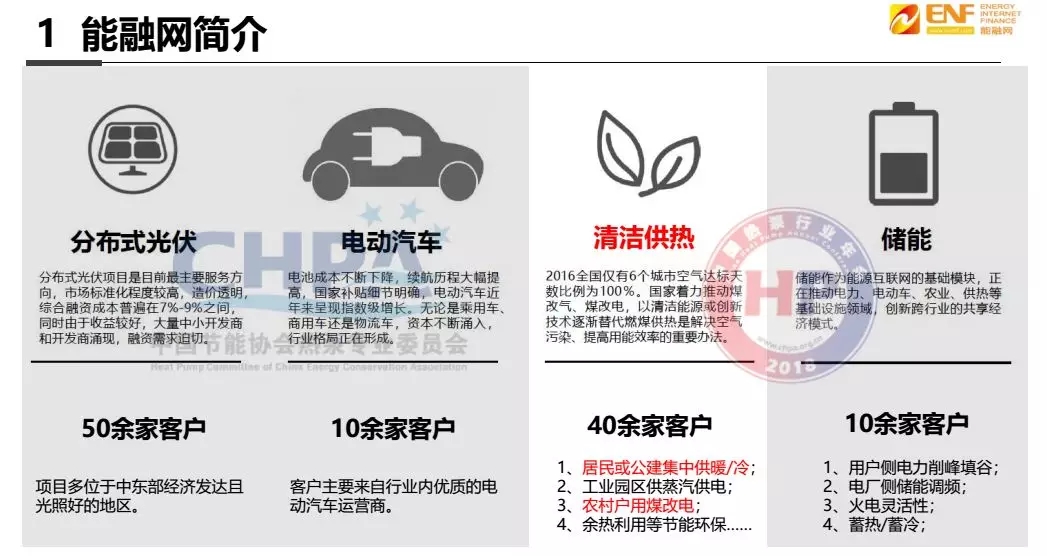 ÄÜÈÚÍøÊÇÒ»¸öרÃÅÕë¶ÔÂÌÉ«ÄÜÔ´µÄͶÈÚ×Ê·þÎñƽ̨£¬·þÎñ·¶Î§°üº¬·Ö²¼Ê½¹â·ü¡¢µç¶¯Æû³µ¡¢Çå½à¹©ÈÈ¡¢´¢ÄÜËÄ´óÁìÓò¡£×Ô2017Äê³õ£¬ÎÒÃÇ¿ªÊ¼¹Ø×¢Çå½à¹©ÈÈÁìÓò£¬Ö÷Òª·ÖΪ¹¤Òµ¹©ÈȺ;ÓÃñ¹©ÈÈÁ½¸ö·½Ïò¡£¹¤ÒµÔ°Çø¹©ÈÈÊÇ×îÔçÍ»ÆÆµÄÁìÓò£¬²»¹ýËæ×Žü¼¸ÄêÀ´¡°Ãº¸Äµç¡±µÄ·¢Õ¹£¬ÎÒÃǵÄÖØµã¿ªÊ¼×ªÏòÁ˾ÓÃñ¹©ÈÈ¡£