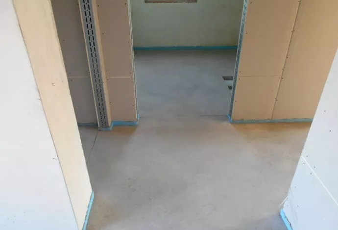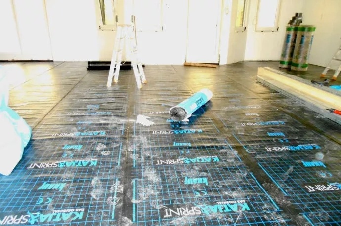 ͼΪµØÅ¯µØÃæ¹¹ÔìÖУ¬×îµ×²ãµÄ·ÀË®¸ô³±Ä¤µÄÆÌÉèÊ©¹¤ÏÖ³¡
