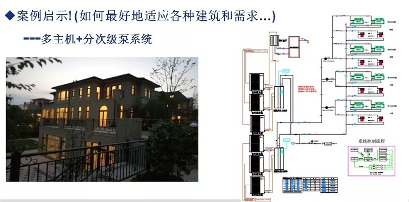 ÏÂͼÊÇÎÒÃÇÔÚº¼ÖݵÄÒ»¸ö´ó±ðÊû°¸Àý£¬¾Í²ÉÓÃÁ˶àÖ÷»ú+·Ö´Î¼¶±Ãϵͳ£¬¿ÕÆøÔ´ÈȱÿÉÒÔºÍÄ©¶ËÖ±½ÓͨѸ¶Ô½Óͬʱ¿ØÖƶÔÓ¦ÄÜÁ¦µÄѹËõ»úºÍ´Î¼¶±ÃµÄÊä³ö£¬ÕâÀïÃæÔËÓÃÁ˺ܶà¸ÐÓ¦µÄ¼¼Êõ£¬Óû§¶ÔÏÖÔÚÕâ¸öϵͳ×ÜÌåÉÏ»¹ÊǷdz£ÂúÒâµÄ£¬ÌرðÊÇÎÒÃǽâ¾öÁ˼«µÍ¸ººÉÏÂ(ÈçÖ»ÓÐÁ½ÈËÔÚ¼Ò¿ªÒ»¸ö·¿¼äµÄÖÆÀä)ʱ£¬Ë®±ÃÊäË͹¦ºÄµÄÎÊÌ⣬ÔÚ´ó±ðÊûÀï10%ÒÔϵĵ͸ººÉÔËÐÐÕ¼¾Ý90%ÒÔÉϵÄʱ¼ä±È£¬Òò´Ë£¬µÍ¸ººÉϵÄÄÜЧ±È¶ÔÓû§¶øÑԾͷdz£¹Ø¼ü!ĿǰÎÒÃǵļ¼Êõƽ̨Íêȫ֧³Ö¸öÐÔ»¯µÄÒªÇó£¬ÕâÊÇÎÒÃÇÖÇÄÜÈȱÃÄÜ×öµ½µÄ¡£