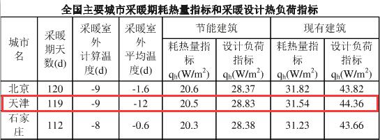 根据《全国主要城市采暖期耗热量指标和采暖设计热负荷指标》,天津地区非节能建筑每平方米采暖季供暖所需热量为44.36w/㎡*24h*119d/1000≈126.69kwh/㎡